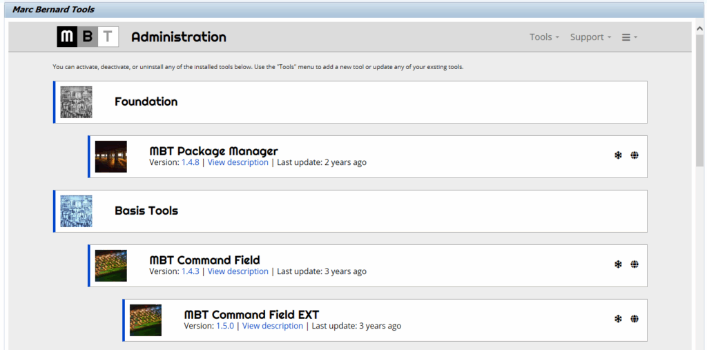 For each tool, you see its name, the installed version, a link to the description of the tool, and the last time the tool was updated. The system will also show a banner if a new version is available or if a tool was updated that day.