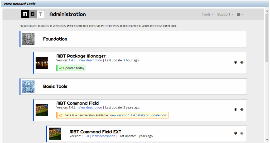 MBT Package Manager is the foundation for all Marc Bernard Tools. It comes with an easy-to-use, HTML-based management cockpit (shown above) which provides the framework for installing, uninstalling, activating, and deactivating any of the available tools. MBT Package Manager also manages all versions of, dependencies between, and updates of all tools. If your system is connected to the Internet, MBT Package Manager will be able to automatically check for new versions of tools and install the updates giving you an always up-to-date system.